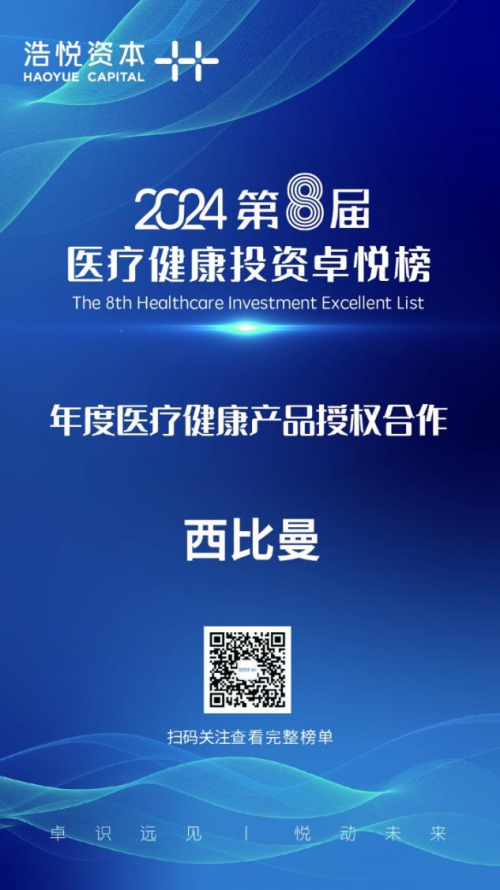 2024年4月26日,浩悦资本正式发布了“2024第八届医疗健康投资卓悦榜”,西比曼生物科技荣膺“年度医疗健康产品授权合作”奖项。